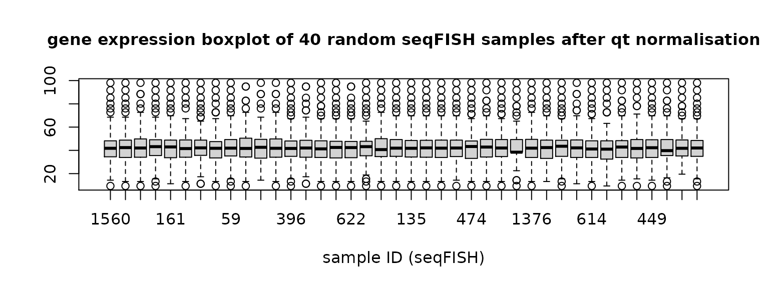 main = "gene expression boxplot of 40 random seqFISH samples",