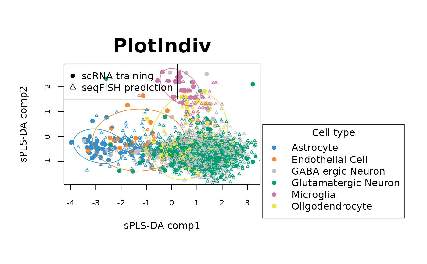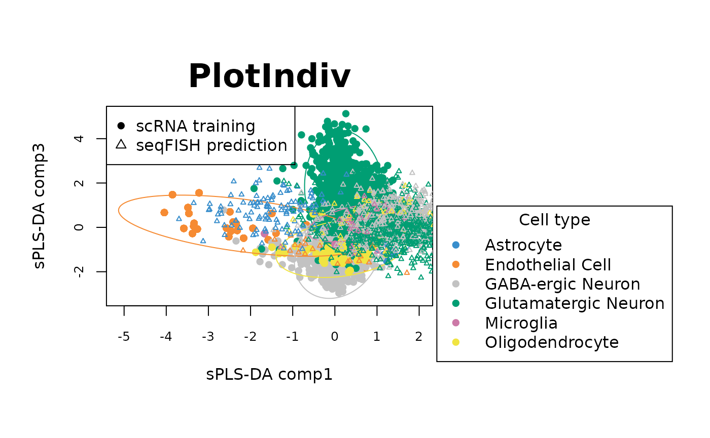 The provided datasets have been well preprocessed. We further did quantile normalisation across all samples to try to eliminate batch effect before the supervised stage of learning. We also oversampled the data since the classes were imbalanced. The learning algorithm was divided into two analysis stages. First was to learn a classifier on scRNA data using sPLS-DA model and predict seqFISH data using the tuned sPLS-DA