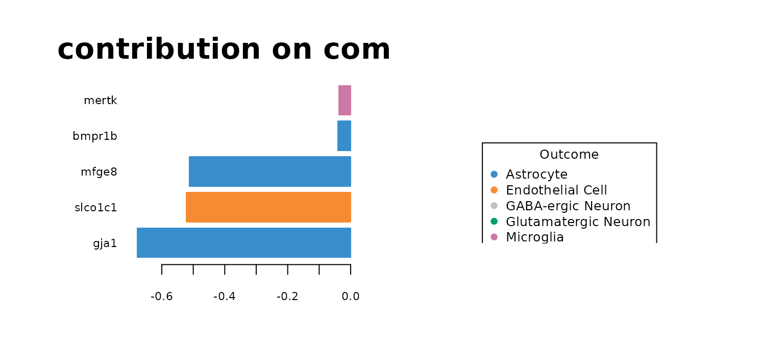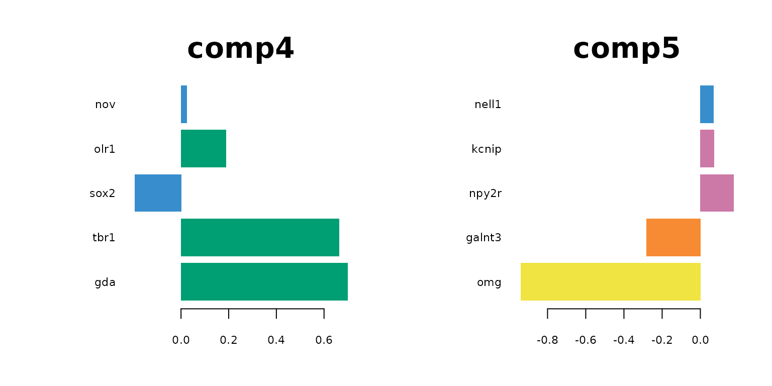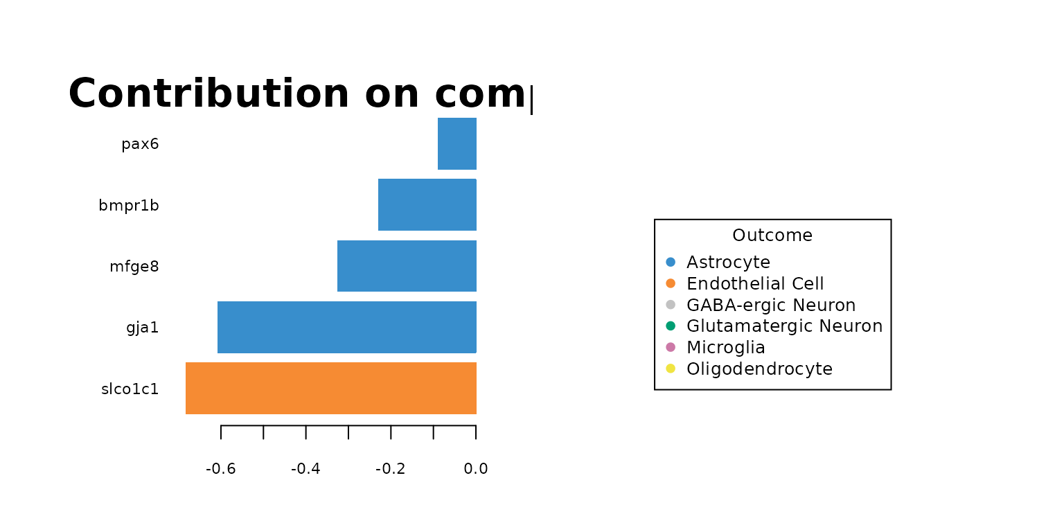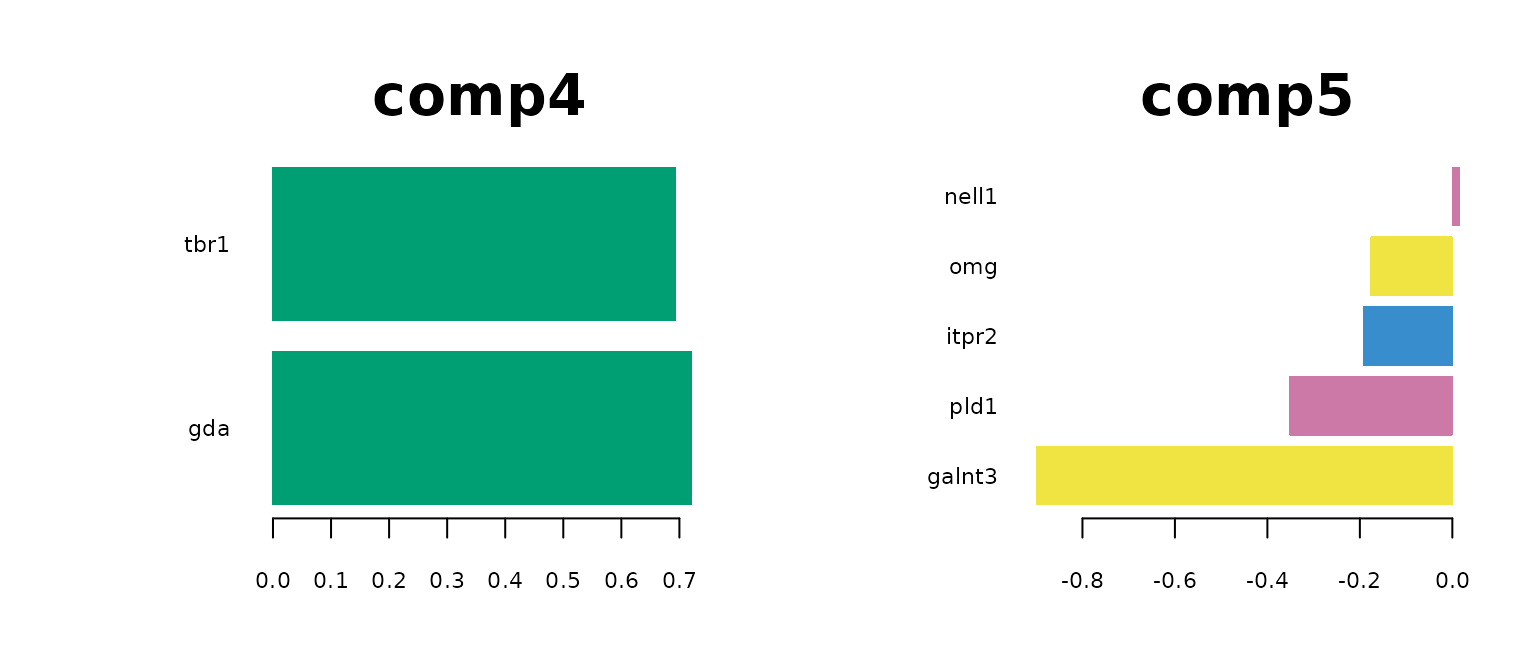 plotLoadings(mint.train, comp = 5, method = 'median', contrib = 'max' ,legend = FALSE, title = "comp5",cex.main = 3)