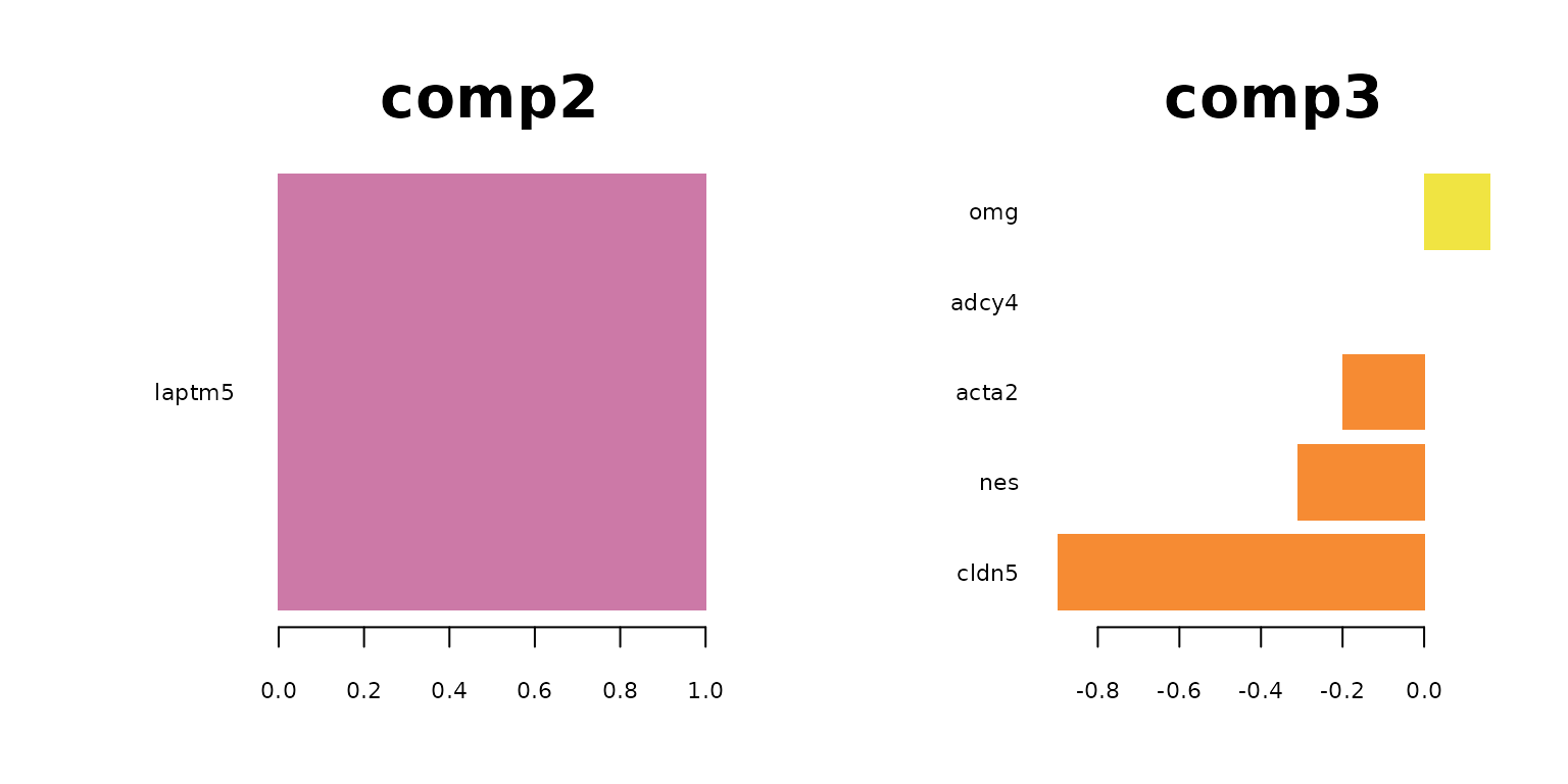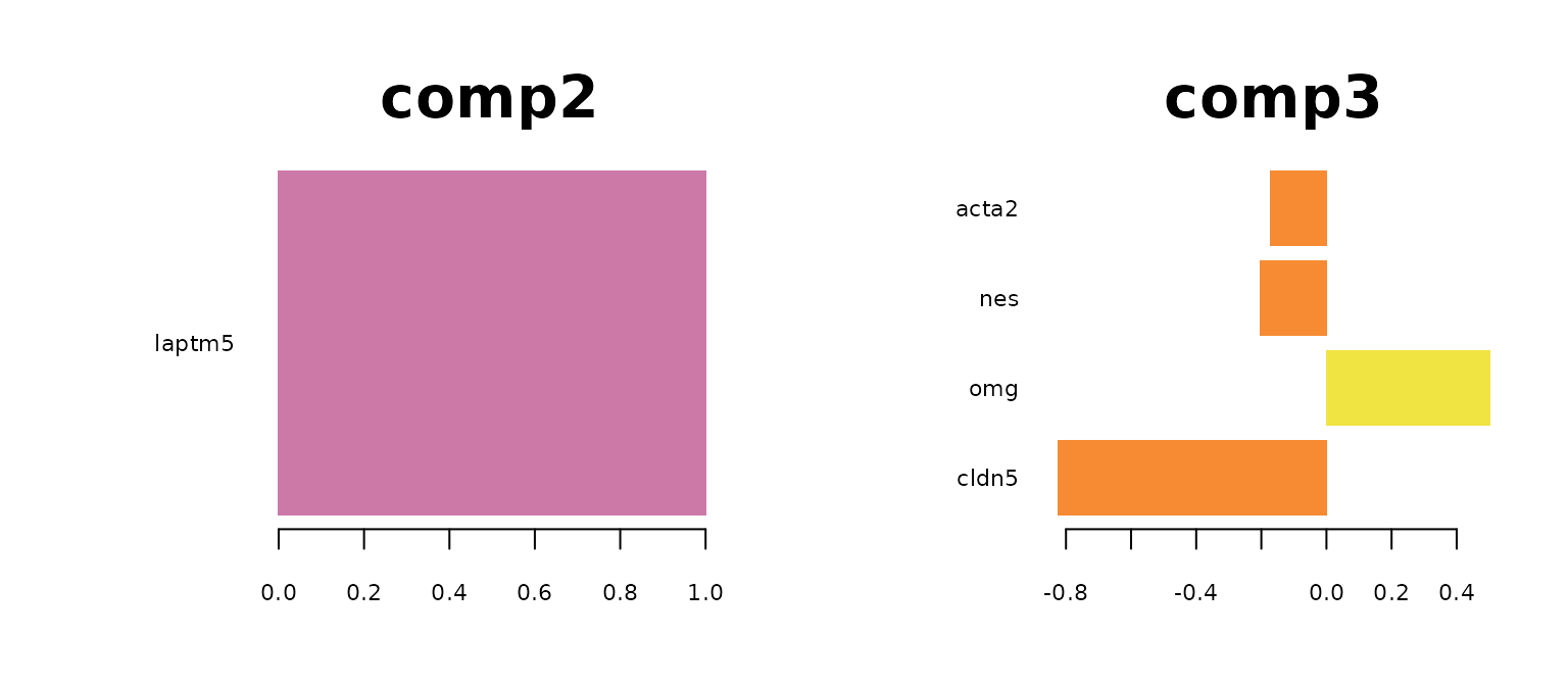 plotLoadings(mint.train, comp = 2, method = 'median', contrib = 'max' ,legend = FALSE, title = "comp2",cex.main = 3)