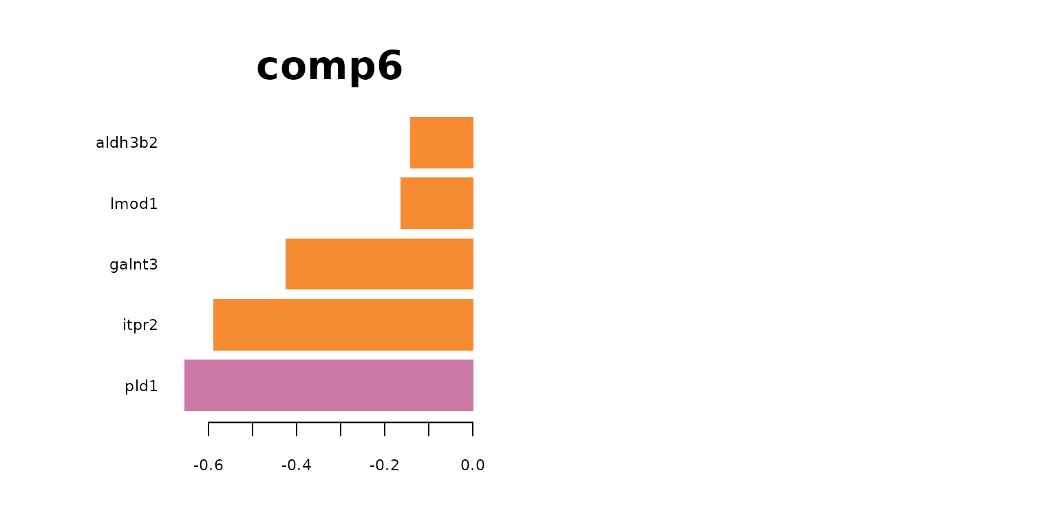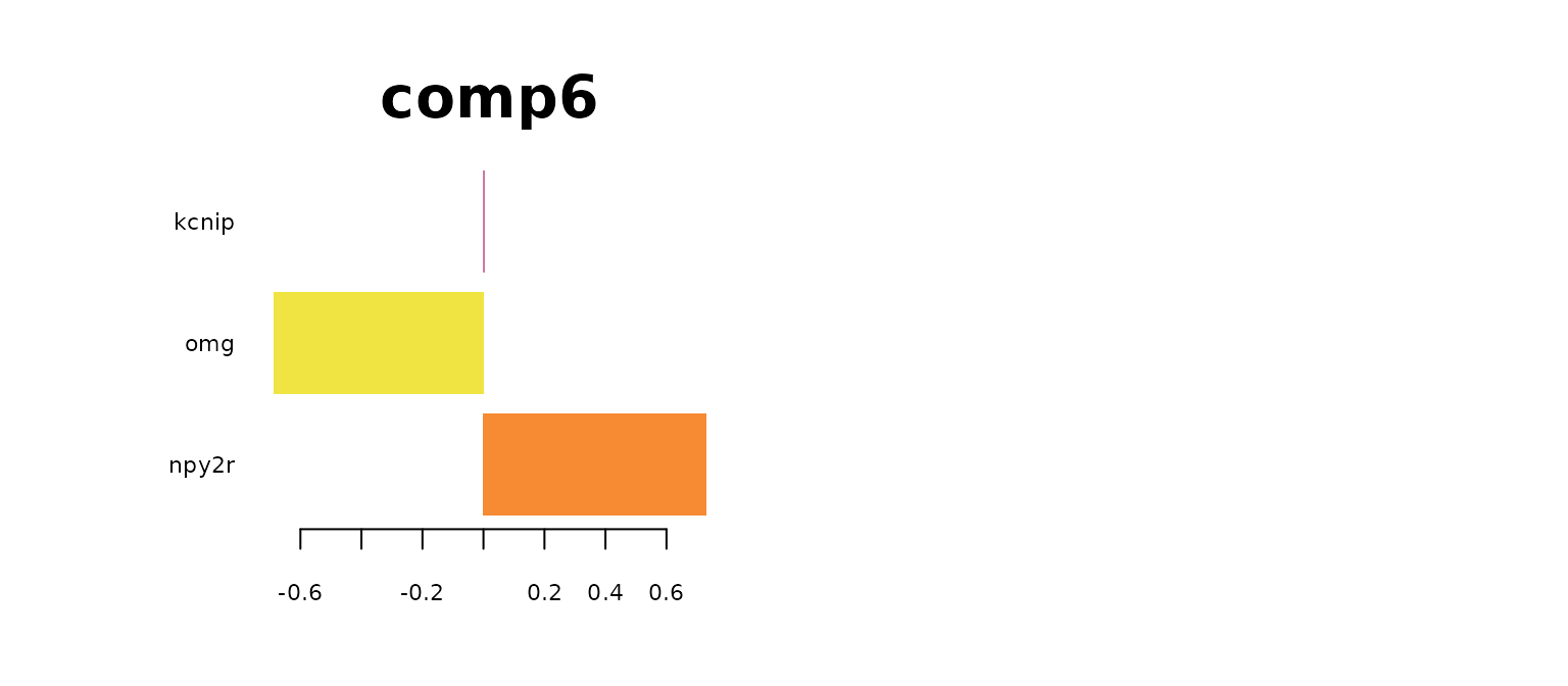 plotLoadings(mint.train, comp = 6, method = 'median', contrib = 'max' ,legend = FALSE, title = "comp6",cex.main = 3)