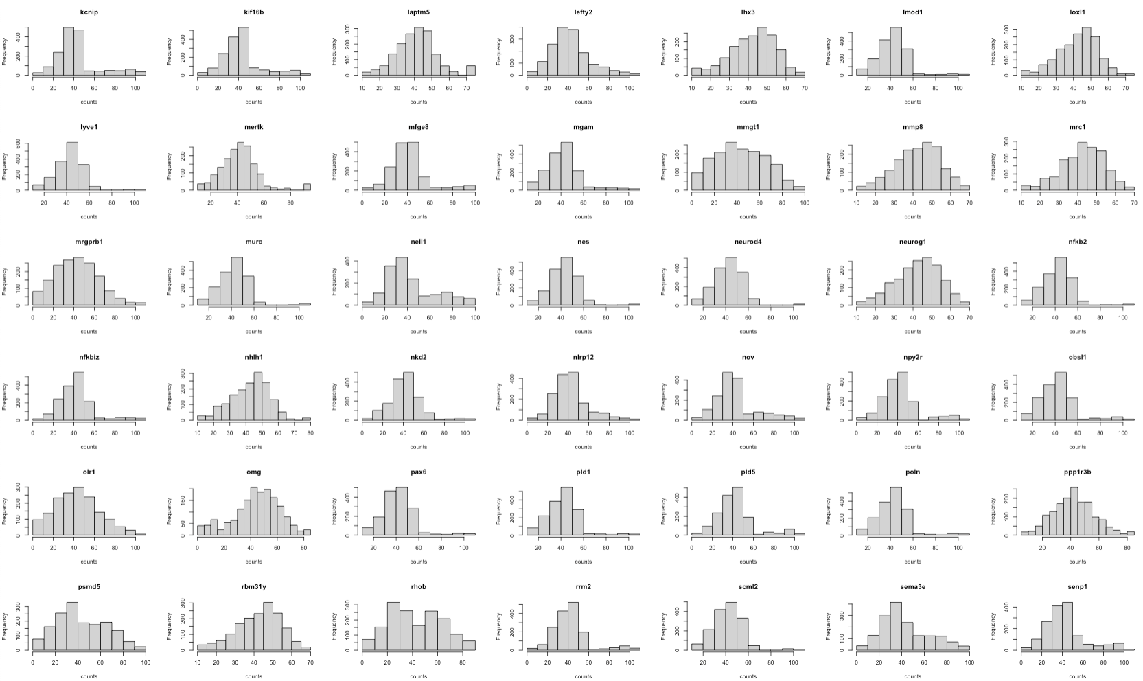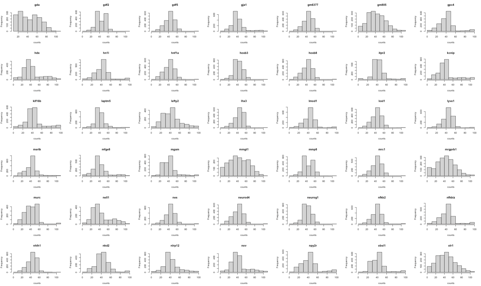 The histograms show that the features (genes) are of the same scale and the distributions are almost normal. It means that there’s no need for further feature normalisation.