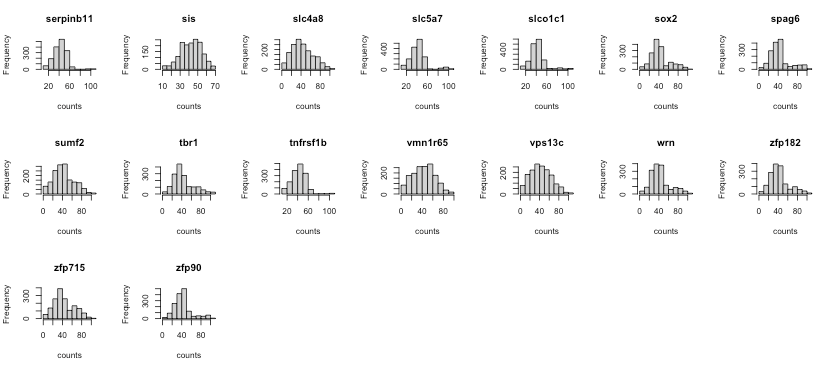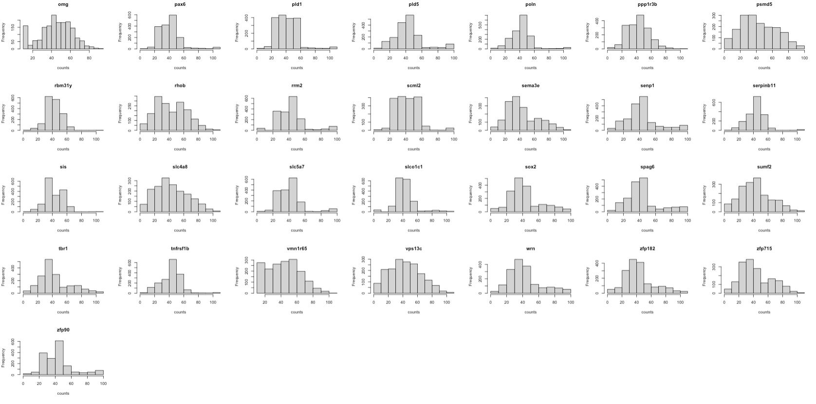 plot(distribution[i,-1],ylim = c(30,70), main = paste("gene distribution of",
