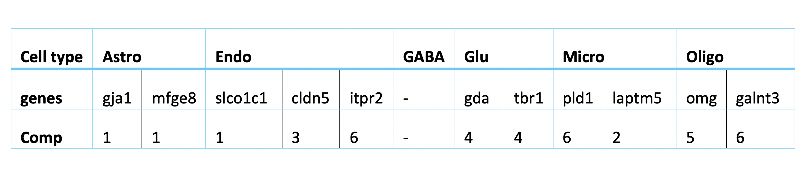 The selection of features were done by restricting the number of genes selected on each component. The final sPLS-Da model selected 24 genes to predict the cell types of the cells from the scRNA-seq data. The genes that contribute most to each classes were summarised and many of them were already referenced in the literature. The predictive top genes selected by MINT algorithms were in agreement with the top genes selected with sPLS-DA. It means that the batch effect does not influence much of the model training. The following table summarises the final prediction of seqFISH data. Finally, we visualised the mean gene distribution of the samples in each class. Each of the class presents a very distinct distribution pattern.